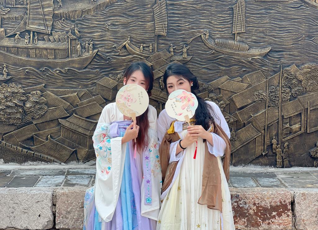 践行志愿精神,彰显青春风采。社会实践队员结合自身专业优势,在南阳古镇开展系列文旅宣传活动,相关实践活动被新华网报道。实践队员们协助镇政府梳理南阳古镇大运河历史脉络,整理古镇漕运史、南阳闸(省级文保)闸官厅史籍;在镇团委的带领下,参观体验了新建村和美乡村项目建设、北二村逸农合作社经营的“渔家婚礼”“状元巡游”等文化演艺项目,采用线上直播的方式,推广宣传古镇特色婚礼文化,并对古镇的文化产业发展、文创手造设计、电商直播模式等进行了详细调查,依靠高校智库对古镇发展提出意见,为南阳镇带来新的知识和活力。蓝天碧水、荷花鸥鹭,她们身着华丽汉服,参与古镇文旅宣传片的拍摄和剪辑工作,吸引了大量网友的观看和点赞,极大地提升了南阳古镇的知名度和美誉度。