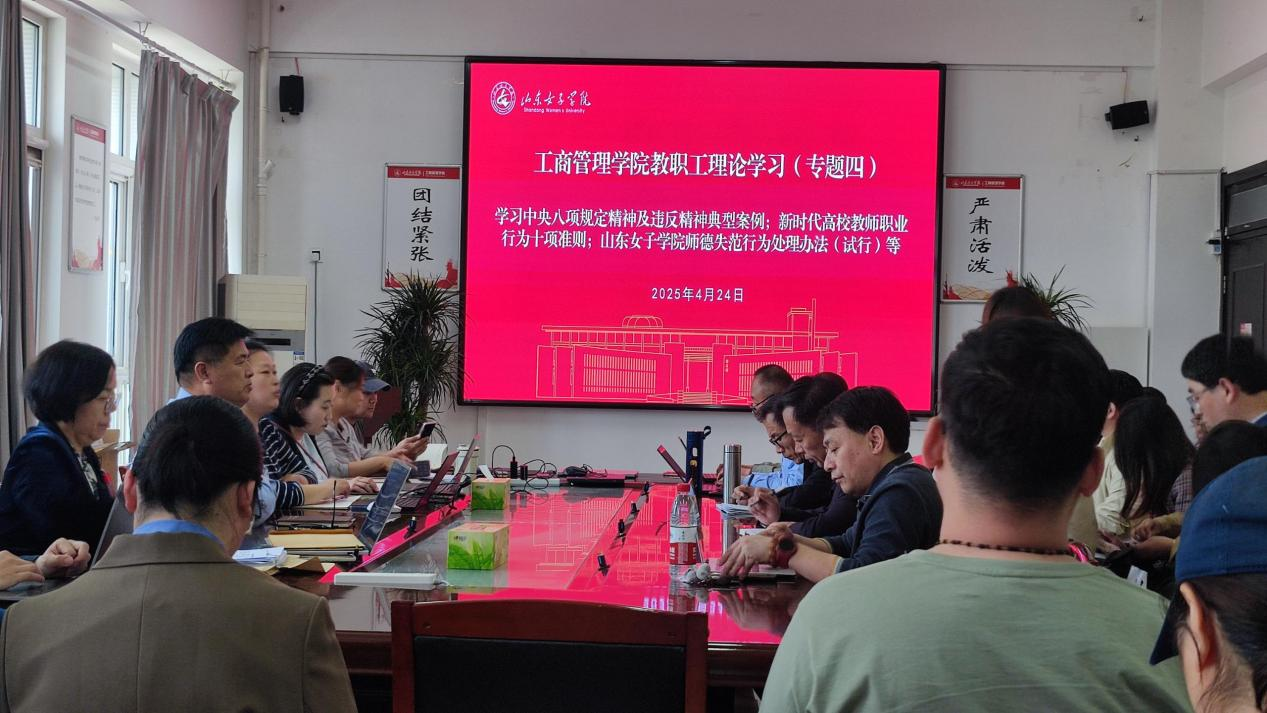 2025 年 4 月 24日下午,工商管理学院于博雅楼A401 会议室召开全体教职工理论学习会,专题学习中央八项规定精神及典型案例警示教育、新时代高校教师职业行为十项准则,以及taptap点点体育软件师德失范行为处理办法(试行)等,学院党委书记耿华主持会议并讲话。
