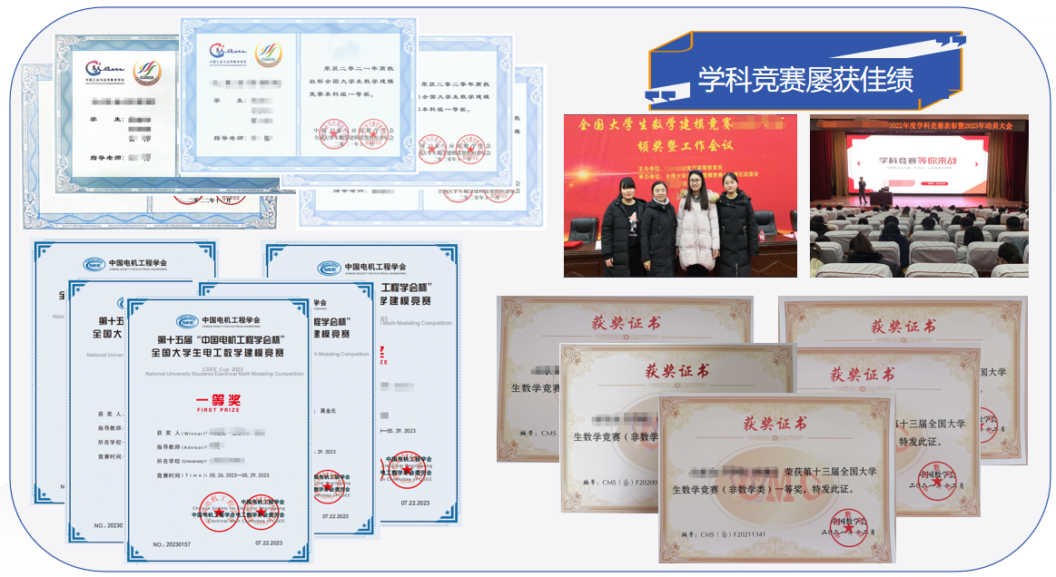 1. 学科竞赛:指导学生参加“高教社杯”全国大学生数学建模竞赛荣获国家一等奖3项、二等奖3项、省奖80余项的优异成绩;