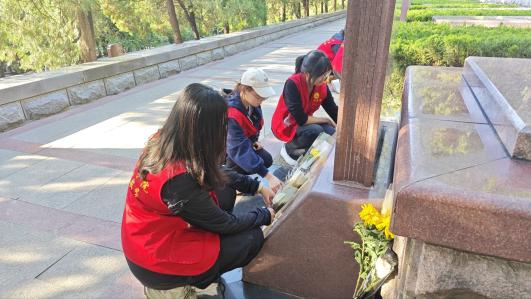 在聆听了英雄事迹后,全体师生面向革命烈士纪念塔肃立默哀,表达对革命先烈的沉痛悼念和无限敬仰。默哀仪式庄重肃穆,空气中弥漫着对英魂的深切追思。在一分钟的默哀中追思英烈,静静感受那段烽火岁月里的热血与奉献。默哀结束后,大家有序行动,手持抹布擦拭墓碑、清理周边杂物,分工协作维护陵园整洁,在实践中强化了党员和团员的历史使命感与责任感。